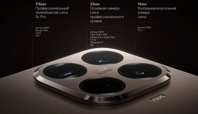 Основная камера Оптический объектив Leica Summilux. VARIO-SUMMILUX 1:1.62-3.0/15-115 ASPH.Основная камера Leica 23мм (50Мп, датчик изображения Light Fusion 900, 2,4мкм 4-в-1 Super Pixel, f/1.62, OIS, эквивалентное фокусное расстояние 23мм). Супертелеобъектив Leica 115мм (50Мп, f/3.0, OIS, эквивалентное фокусное расстояние 115мм). Ультраширокоугольная камера Leica 15мм (12Мп, f/2.2, эквивалентное фокусное расстояние 15мм, угол обзора 120°)