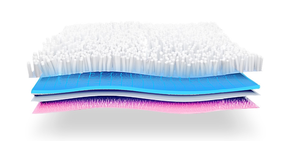 Кроме горизонтального разделения на 2 зоны, насадка состоит из 3 разных слоёв материалов: наружный слой, с помощью которого и происходит сбор пыли и грязи, средний адгезионный слой, который объединяет два других слоя и притягивает к себе грязь, а также внутренний нейлоновый слой, который придаёт насадке необходимую жесткость и способен оттереть даже самые тяжёлые загрязнения.