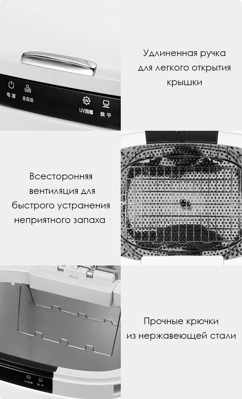 Особенности | Постоянная температура в отсеке для сушки 75 °C / 3 этапа обработки / возможно добавление аромамасел, обдув горячим воздухом на 360° | |