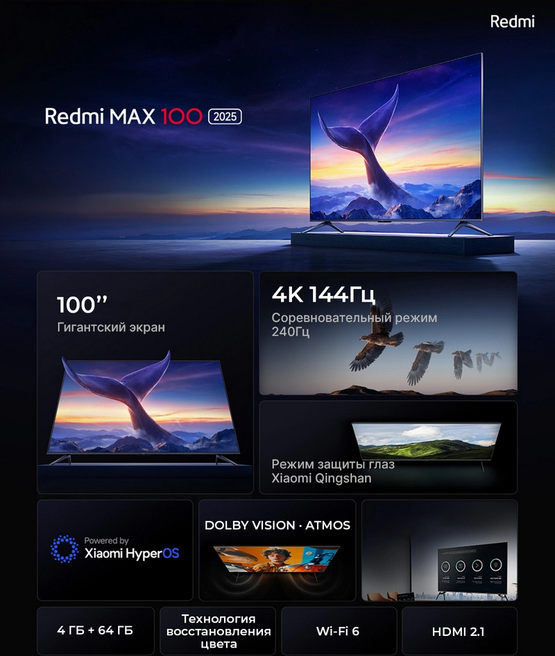 Телевизор Redmi TV MAX 100" — самый большой телевизор в линейке Redmi. Обновленная версия 2025. Невероятные 100 дюймов по доступной цене, 144 Гц частоты обновления экрана и 30 ватт мощного объемного звука, в сочетании с быстрыми HDMI 2.1 и Wi-Fi 6 открывают окно в совершенно новый потрясающий воображение мир.