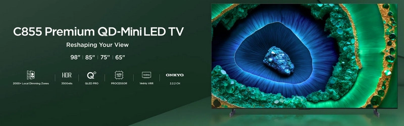 Телевизор TCL 75" C855 144HZ 4K Premium QD-Mini LED — с технологией QD-Mini LED предлагает потрясающее качество изображения благодаря тысячам зон локального затемнения и высокой пиковой яркости, что обеспечивает глубокий чёрный цвет и насыщенные оттенки. Частота обновления до 144 Гц и поддержка современных HDR-форматов делают просмотр фильмов, игр и спортивных трансляций максимально плавным и реалистичным, а мощная акустика с Dolby Atmos и стильный дизайн подчеркивают премиальный уровень модели.