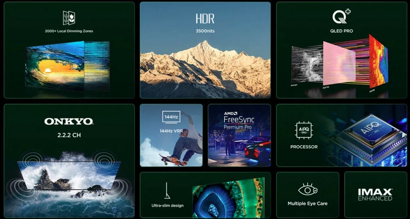 Процессор TCL AiPQ интеллектуально оптимизирует изображение, распознавая объекты на экране, достигая яркости до 3500 нит и контрастности 35 000 000:1. Благодаря 2160 зонам локального затемнения вы получаете гармоничное сочетание ярких и тёмных участков для максимально выразительного и комфортного просмотра.