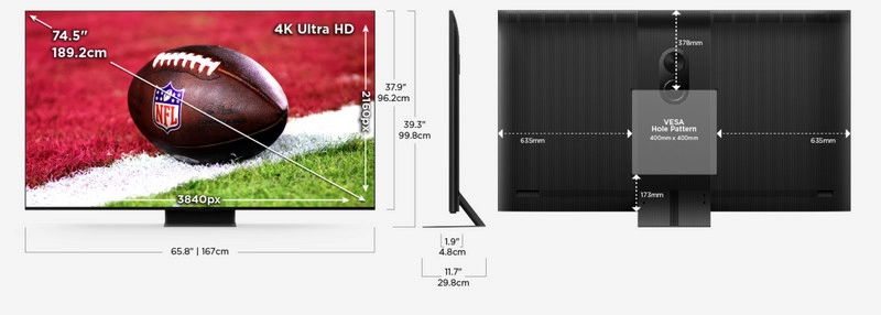 Размеры с подставкой (ШxВxГ) 1671,3 x 998,2 x 297,2 мм