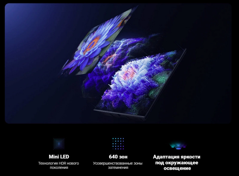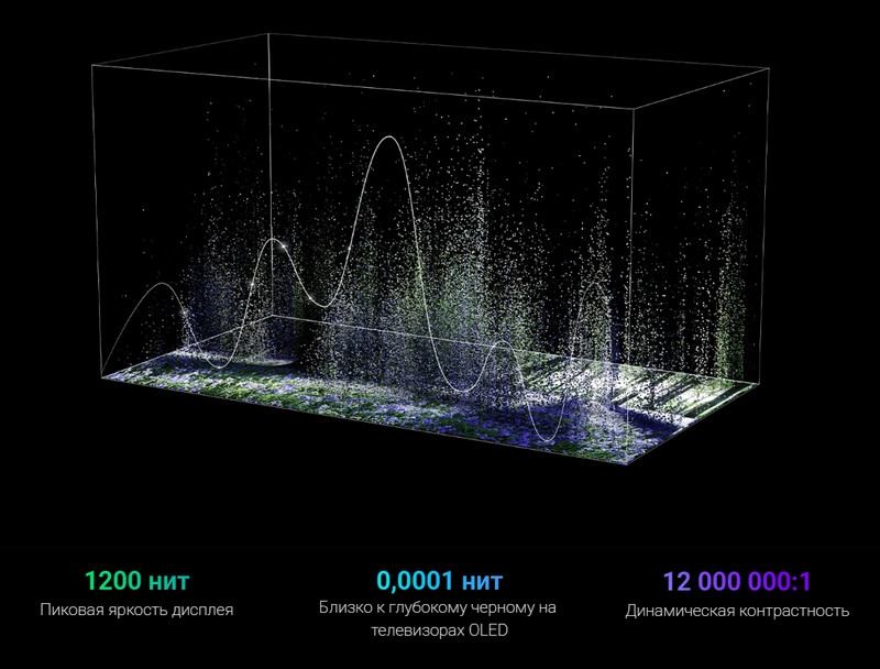 Экран разбит на 640 зон подсветки, которые управляются по отдельности для достижения глубокого чёрного и высокой точности яркости. Даже в тёмных сценах сохраняются чёткие контуры и контраст.