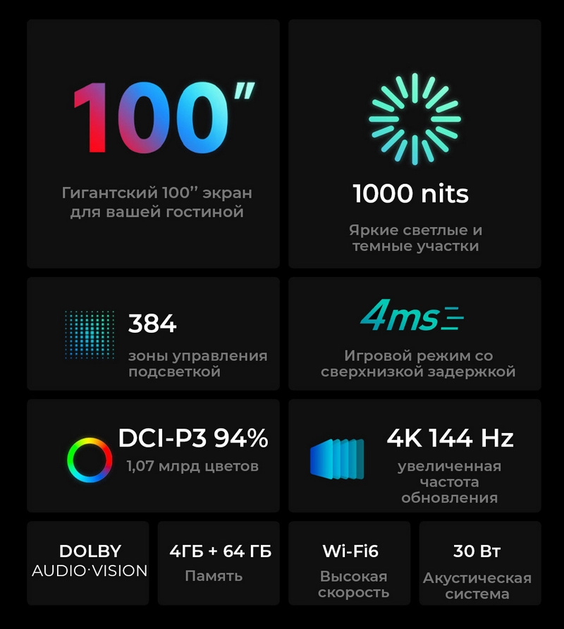 Телевизор Xiaomi TV S Pro 100" 144 Hz — это большой экран с площадью 2,77 м2, 384 независимые зоны подсветки, яркость до 1000 нит и частота обновления экрана 144 Гц. За высокую производительность отвечает четырехъядерных процессор, 4 ГБ оперативной памяти и флеш-накопитель на 64 ГБ.