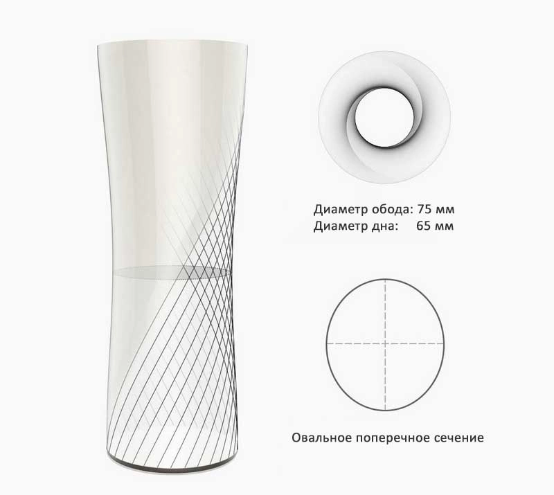 Корпус выполнен в оригинальном дизайне. Диметр обода чашки 75 мм, а дна — 68 мм.