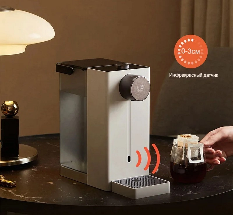 Инфракрасный датчик работает на обнаружение кружки в радиусе 3 см для того, чтобы вода не пролилась мимо кружки.