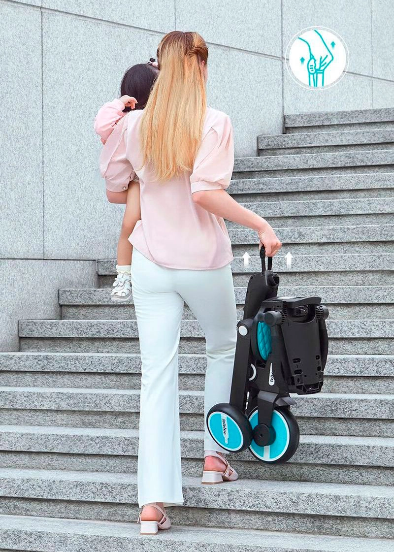 В сложенном виде велосипед весит 6,9 кг. Его легко можно поднять одной рукой, а другой взять малыша.