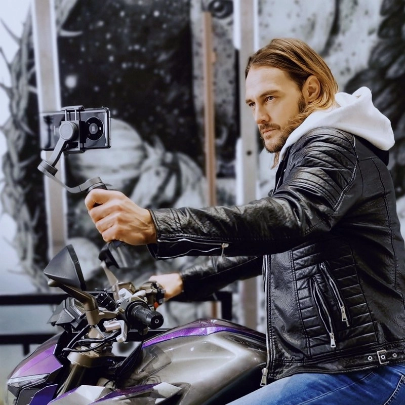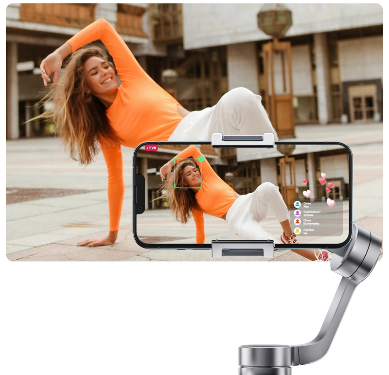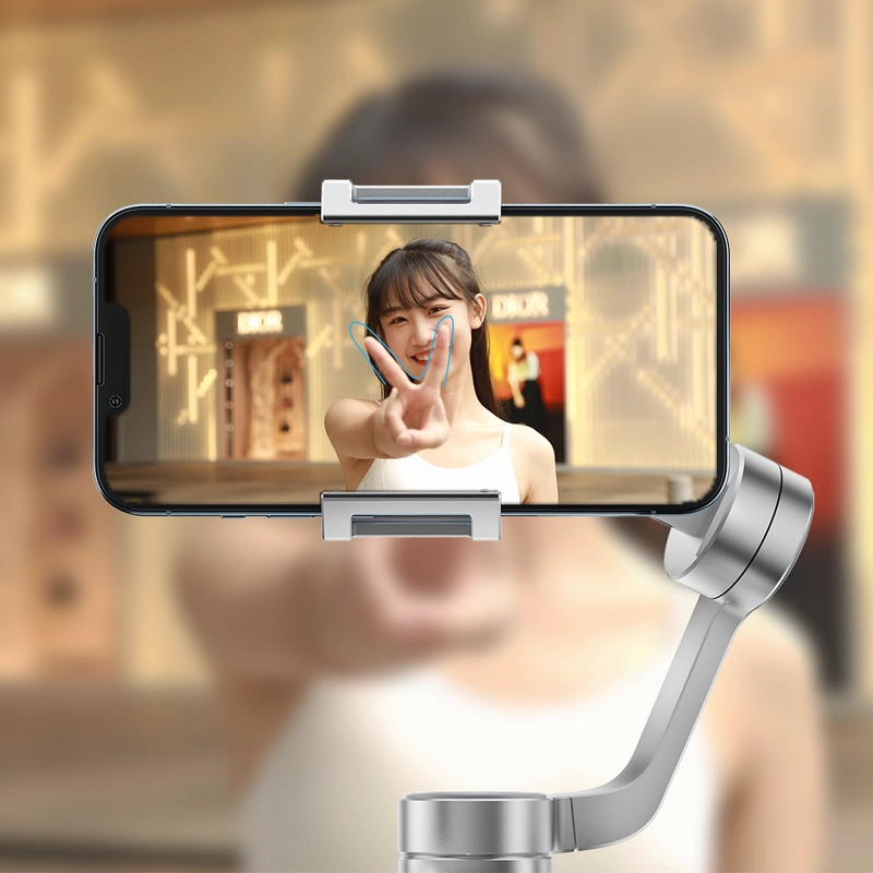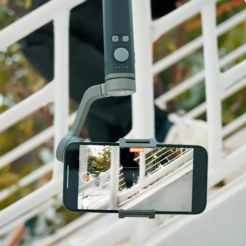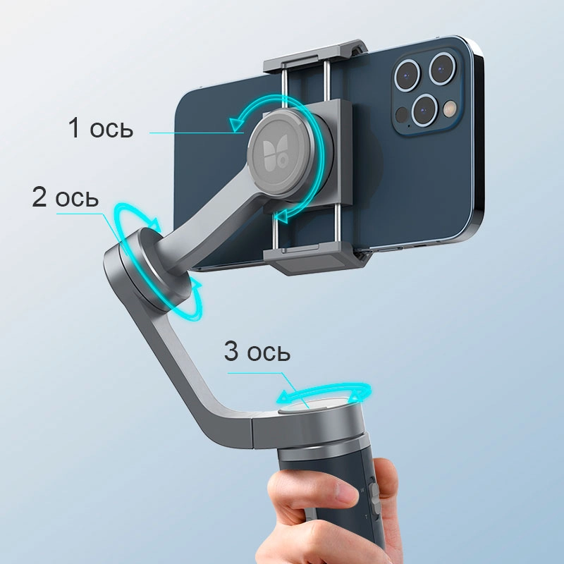 Три оси стабилизатора позволяют зафиксировать смартфон под нужным углом и не боятся дрожания рук во время ходьбы и бега.