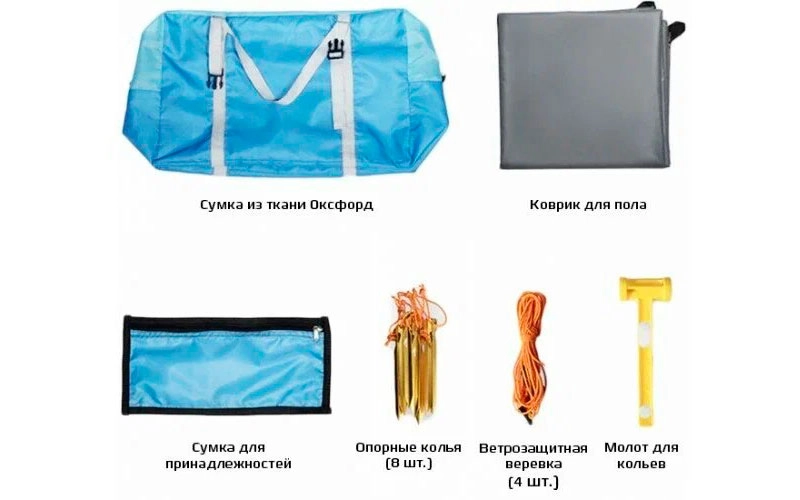 Палатка и все комплектующие хранятся в небольшой сумке с ручками для переноски.