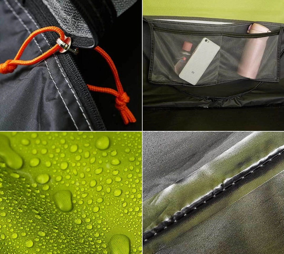 В случае использования палатки в дождливые дни вам не нужно беспокоиться о том, что палатка промокнет, ведь она покрыта водонепроницаемым полиуретановым материалом. В качестве основной ткани, используется плотное полиэфирного волокно 68D 185T. Нижняя часть палатки выполнена из высококачественной водонепроницаемой ткани Oxford 150D и способна выдерживать до 2000 мм осадков.