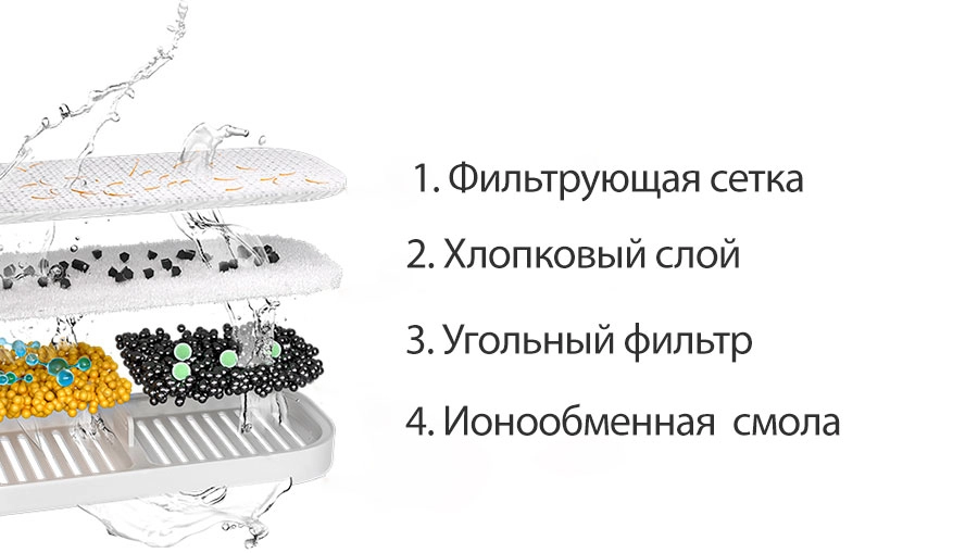 4-слойный фильтр надежно очищает воды от примесей и запахов. Микропористая полипропиленовая пленка улавливает крупные частицы и шерсть, хлопковая прослойка задерживает остаточные загрязнения, частицы активированного угля блокируют посторонние запахи, а ионообменная смола защищает кошек от мочекаменной болезни.