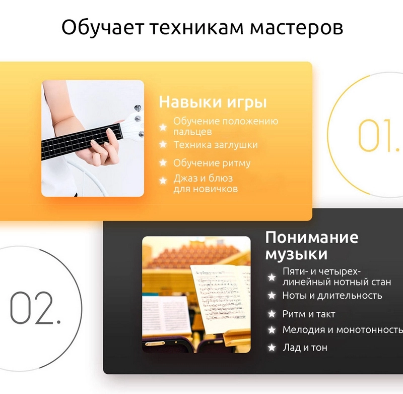 Мигающие подсказки на грифе помогут в освоении новых мелодий. Обучающий процесс проходит в увлекательной игровой форме и будет одинаково интересен, как детям, так и взрослым.