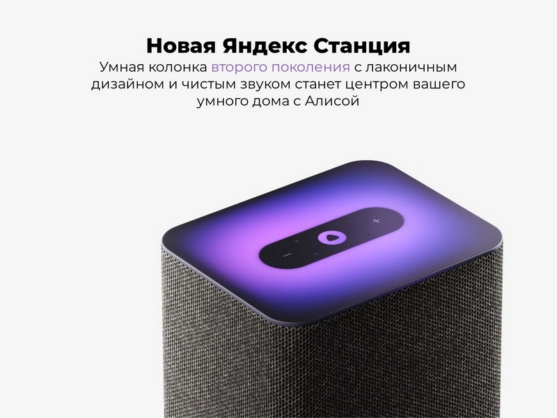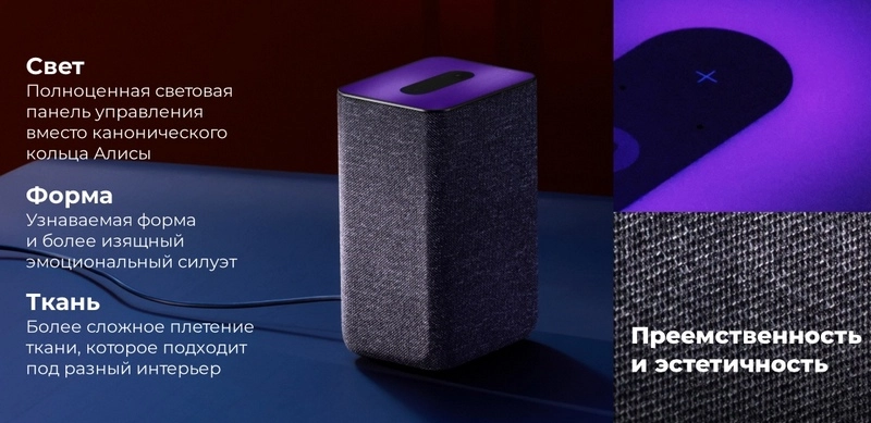 Узкое световое кольцо заменила большая световая панель, колонка сохранила закругленные углы, но стала более вытянутой в ширину. Плотная и прочная ткань гармонирует с общим стилем Яндекс Станции 2.