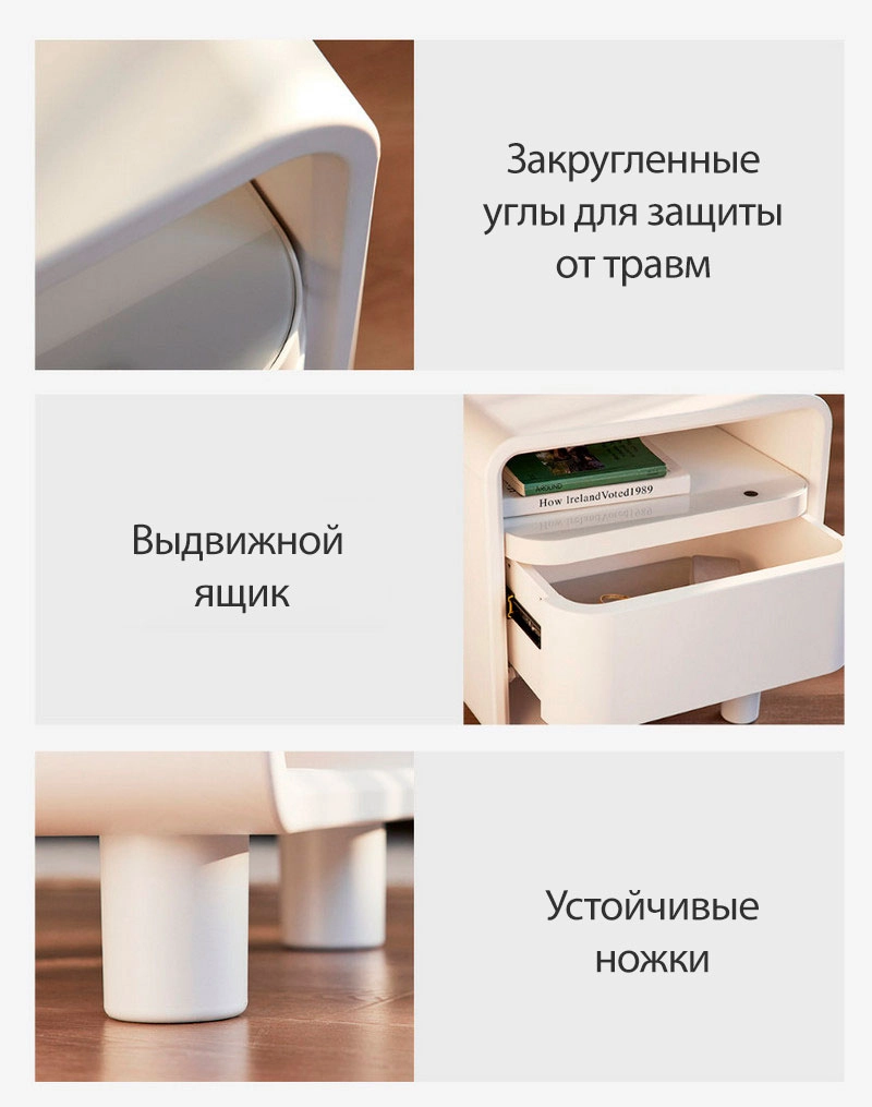 Тумбочка изготовлена из экологичного материала EO-класса, выдерживает нагрузку более 80 кг и сочетает в себе безопасность, долговечность и надёжность.