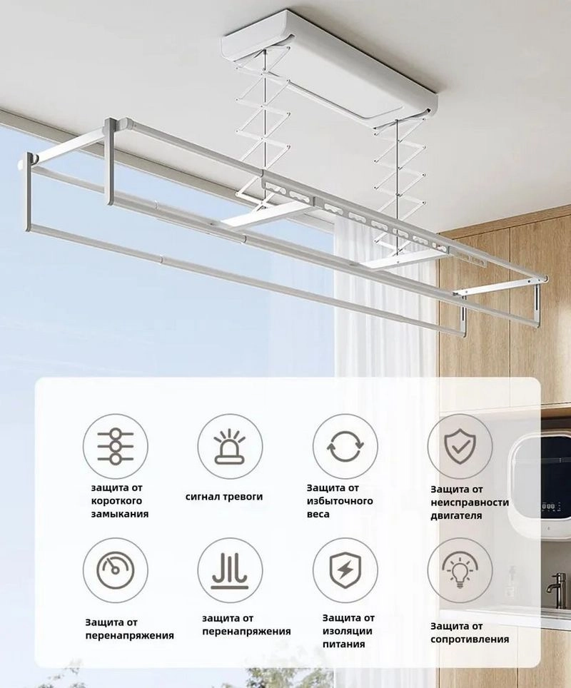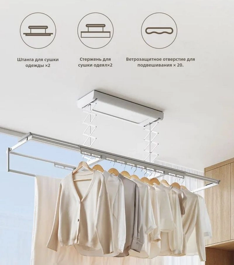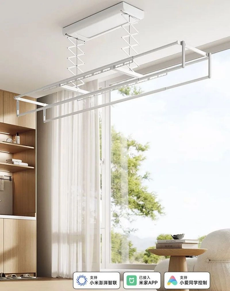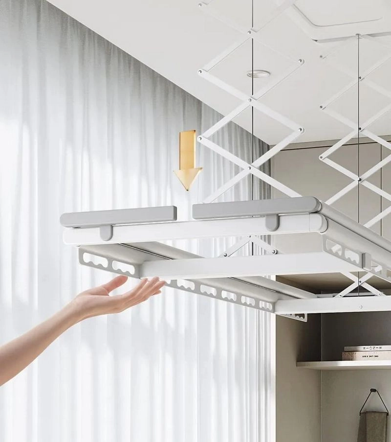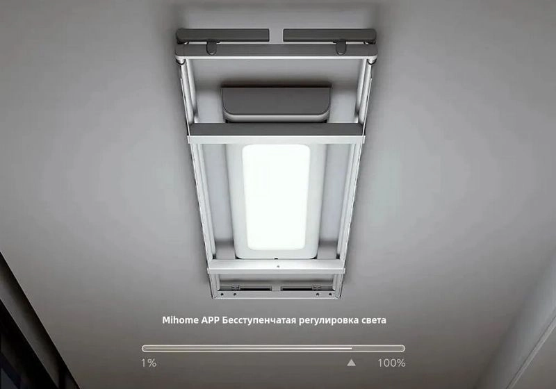 Умная сушилка для белья Xiaomi Mijia 1C (MJLYJ4Q5) — имеет большую грузоподъемность, позволяет сушить габаритные вещи, постельное белье, одеяла. Складывается и прячется под потолок, когда не используется. Встроенная лампа позволяет использовать сушилку в качестве потолочного светильника.