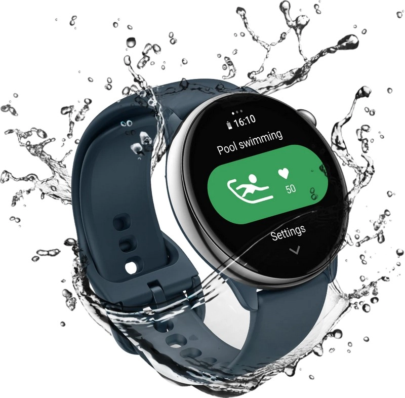 С часами Amazfit GTR Mini можно плавать в бассейне и принимать душ. Водонепроницаемость 5 АТМ позволяется погружаться на глубину до 5 метров.