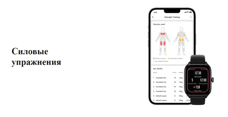 Часы поддерживают десятки силовых упражнений, многие из которых распознаются автоматически. Поддержка интервальных тренировок позволяет им вести подсчет повторений и пауз между подходами. Когда тренировка завершена, то приложение Zepp расскажет о том, какая группа мышц тренировалась и сколько времени.