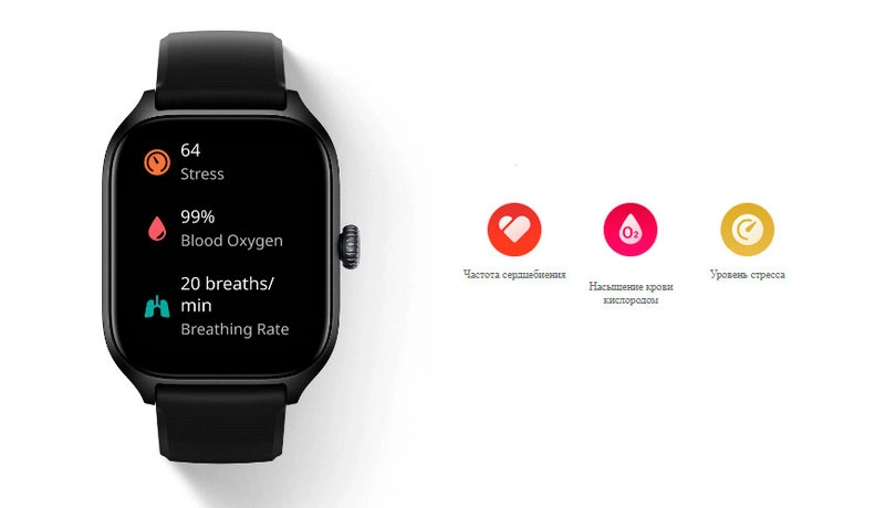 Умные часы осуществляют круглосуточный мониторинг за частотой сердцебиения, уровнем кислорода в крови и уровнем стресса. Также часы могут отслеживать и частоту дыхания. А измерить все четыре метрики можно одним нажатием.