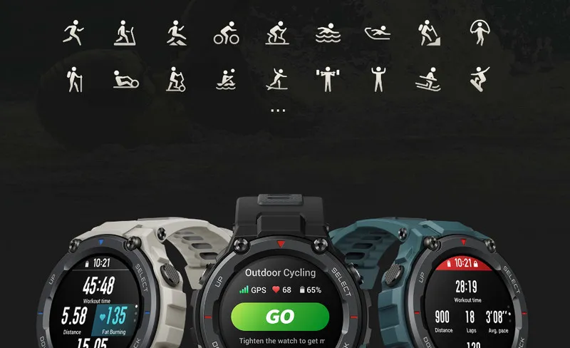 Amazfit T-Rex Pro помогут контролировать эффективность тренировок. Поддерживается свыше 100 разнообразных спортивных активностей. В реальном времени можно отслеживать продолжительность тренировки, преодоленное расстояние, скорость, количество сожженных калорий и др.