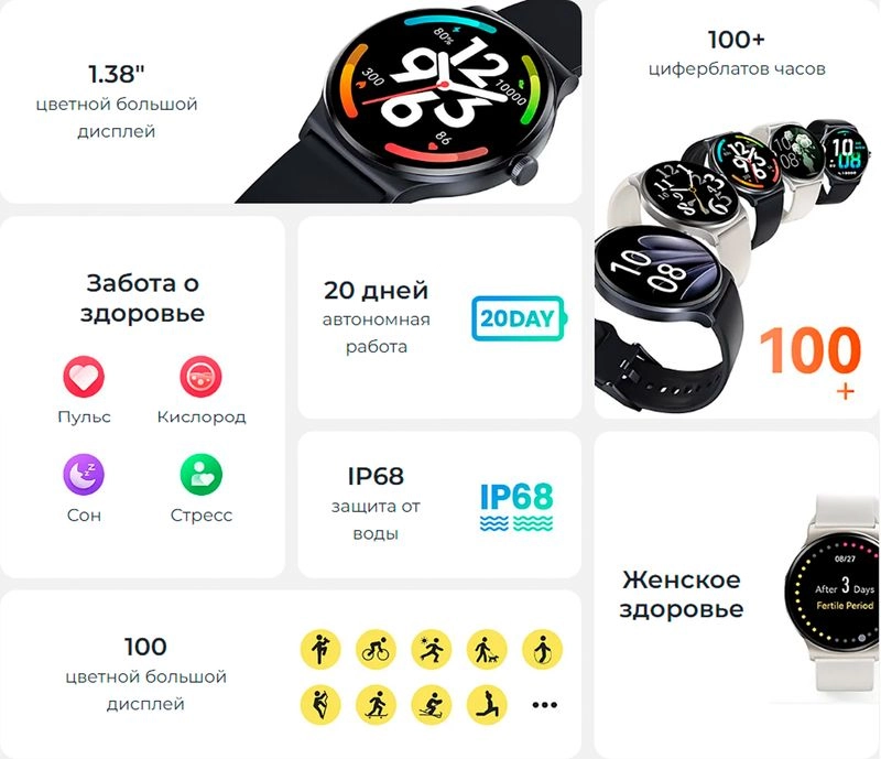 В коллекции умных часов свыше ста циферблатов, охватывающих разные темы. Также предусмотрена установка собственных изображений в качестве циферблата.