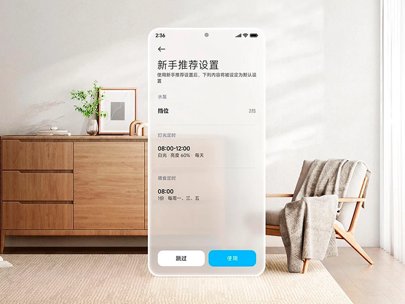 Умный аквариум Xiaomi Mijia оснащён инновационной кормушкой с гибкими настройками. Через приложение Xiaomi Home вы можете программировать время и порции кормления, учитывая особенности ваших рыбок. Ручная регулировка размера подающего отверстия позволяет адаптировать систему под любой тип корма, обеспечивая точное дозирование и исключая перекармливание.
