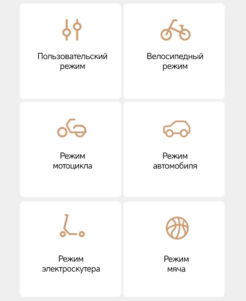 | Режимы работы | Режим велосипеда, режим автомобиля, режим мотоцикла, режим мяча, режим электросамоката, свободный режим (настраивается 1 раз) | |