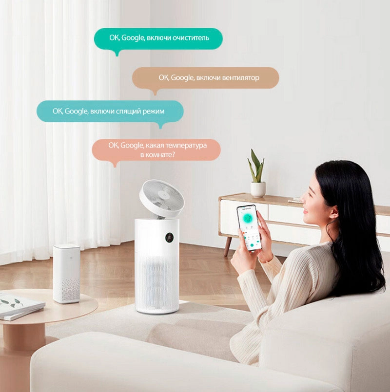 Управлять очистителем можно с помощью сенсорного экрана, через приложение или голосом через умные колонки с ассистентом.