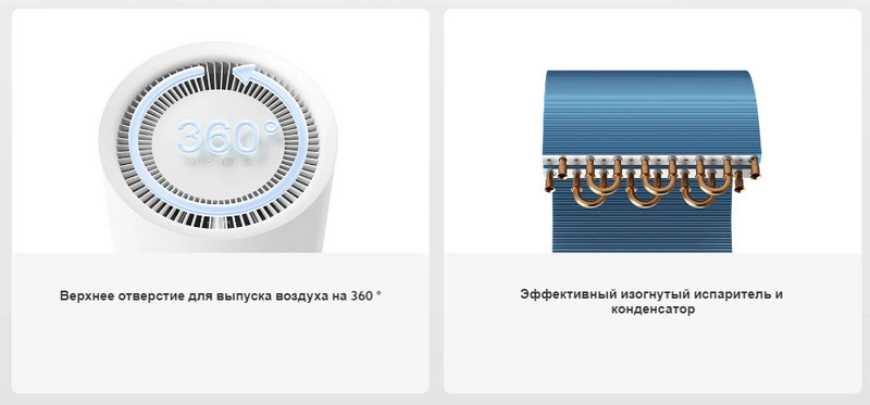Выпускное отверстие воздуховода на 360 ° и испаритель изогнутой формы охватывают большую площадь и повышают эффективность осушителя.
