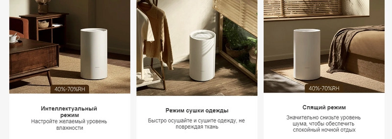 Осушитель может работать в интеллектуальном режиме с поддержкой влажности, заданной в приложении, в режиме сушки одежды или в спящем режиме с минимальным уровнем шума.