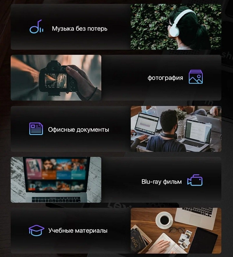 На флеш-карту можно записать все существующие типы данных. Она подходит для работы, учебы, переноса любых данных между устройствами.