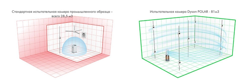 Инженеры компании Dyson проводят множество сложных тестов для проверки эффективности работы своих устройств. Один из тестов называется POLAR Test он бросает вызов стандартным измерениям эффективности очистителей. В помещении реального размера установлено 9 датчиков и нет вентиляторов, кроме очистителя Dyson.