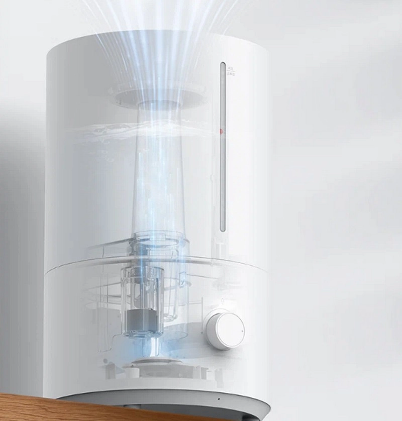 Встроенный вентилятор распыляет вверх облако тумана, которое равномерно распределяется по комнате и увлажняет воздух.