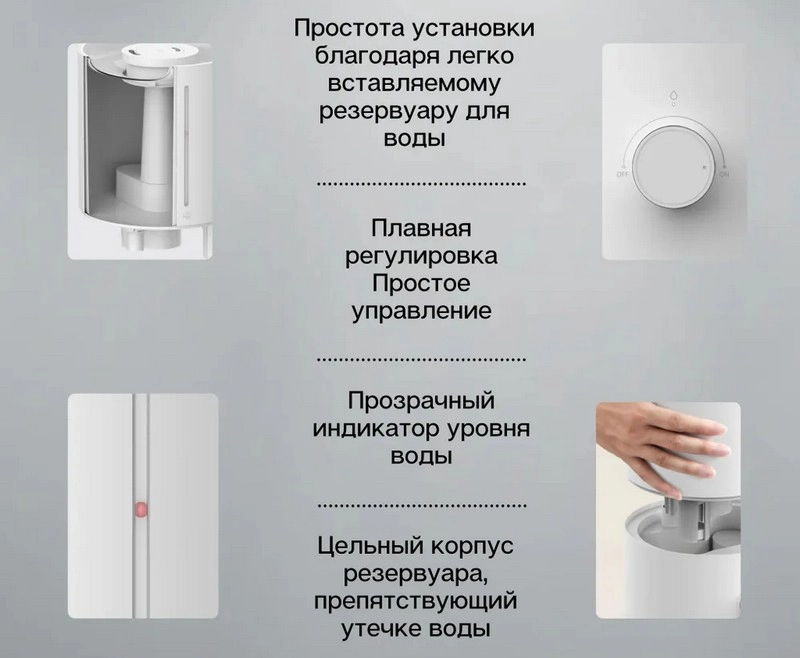 Увлажнитель может работать с тремя режимами мощности. Максимальный режим — это 300 мл/ч. Время работы увлажнителя без долива — от 13 до 36 часов.