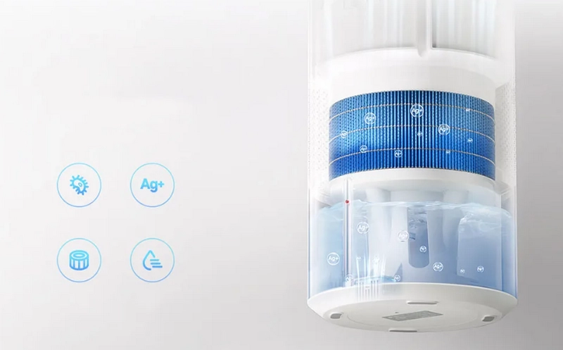 В середине устройства находится антибактериальный фильтр, который фильтрует воду во время дозаправки аппарата. Пока фильтр не используется он высыхает естественным путем, снижая риск появления плесени. В самом резервуаре с водой находится генератор ионов серебра, которые препятствуют бактериальному загрязнению воды.