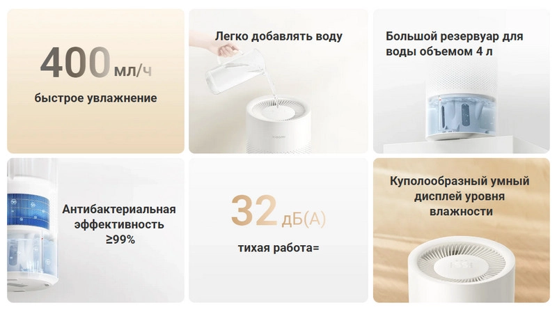 Увлажнитель поддерживает стабильную влажность до 55% со испарением до 400 мл/ч, работает до 19 часов без дозаправки, имеет бак 4 л, уровень шума 32 дБ и антибактериальную защиту..