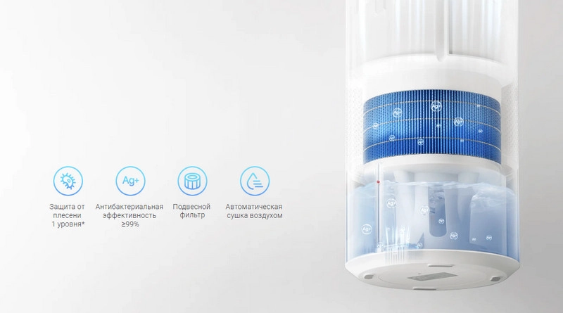 Xiaomi Smart Evaporative Humidifier оснащен подвесным фильтром, который автоматически просушивается после работы, предотвращая появление плесени. Ионизирующий модуль с серебром в резервуаре помогает подавлять рост бактерий, обеспечивая эффективность защиты свыше 99%. Такая система гарантирует чистое и безопасное увлажнение воздуха каждый день.