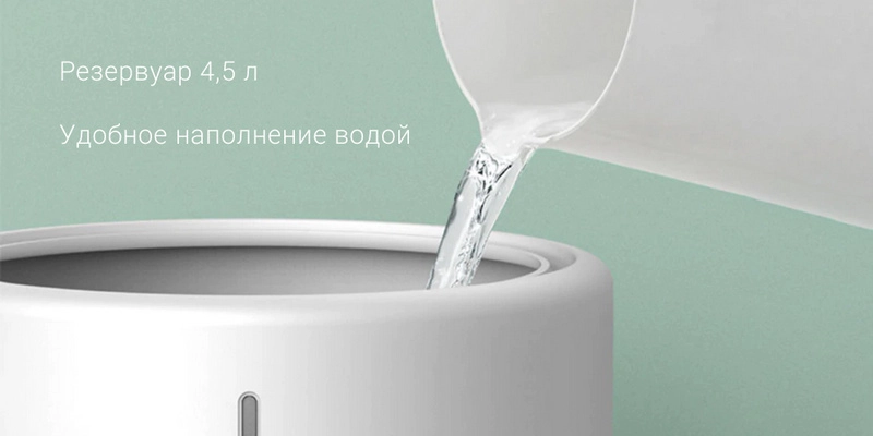 В увлажнитель помещается 4,5 литра воды. Этого объема хватает на срок от 10 до 22 часов работы устройства в зависимости от выбранного уровня влажности.