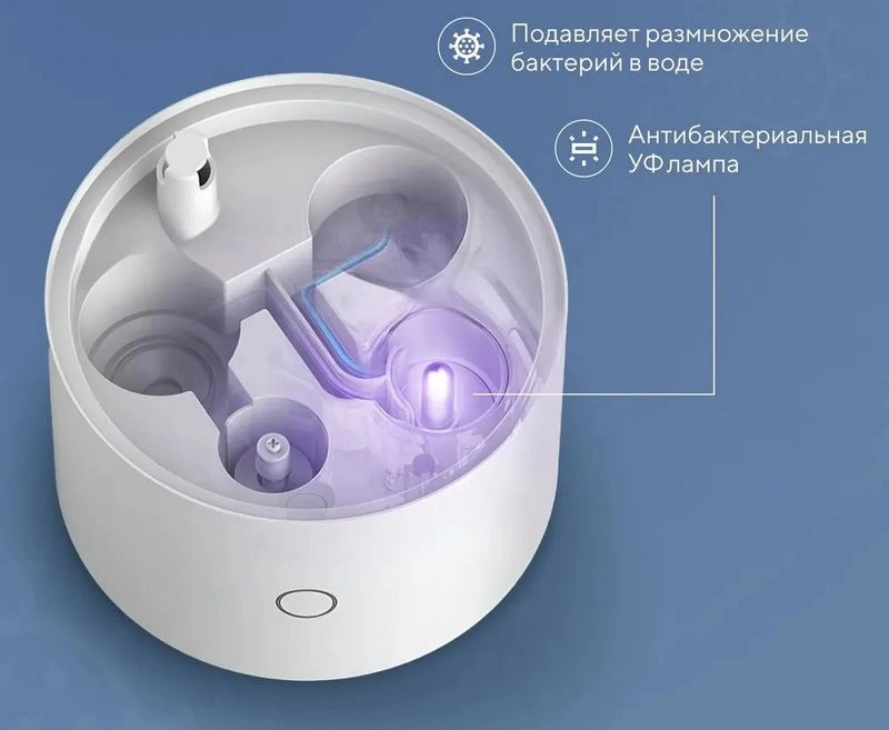 В нижней части увлажнителя встроена ультрафиолетовая лампа, которая стерилизует поступающую воду и уничтожает возбудителей болезней.