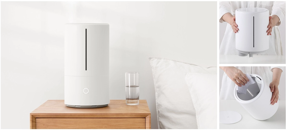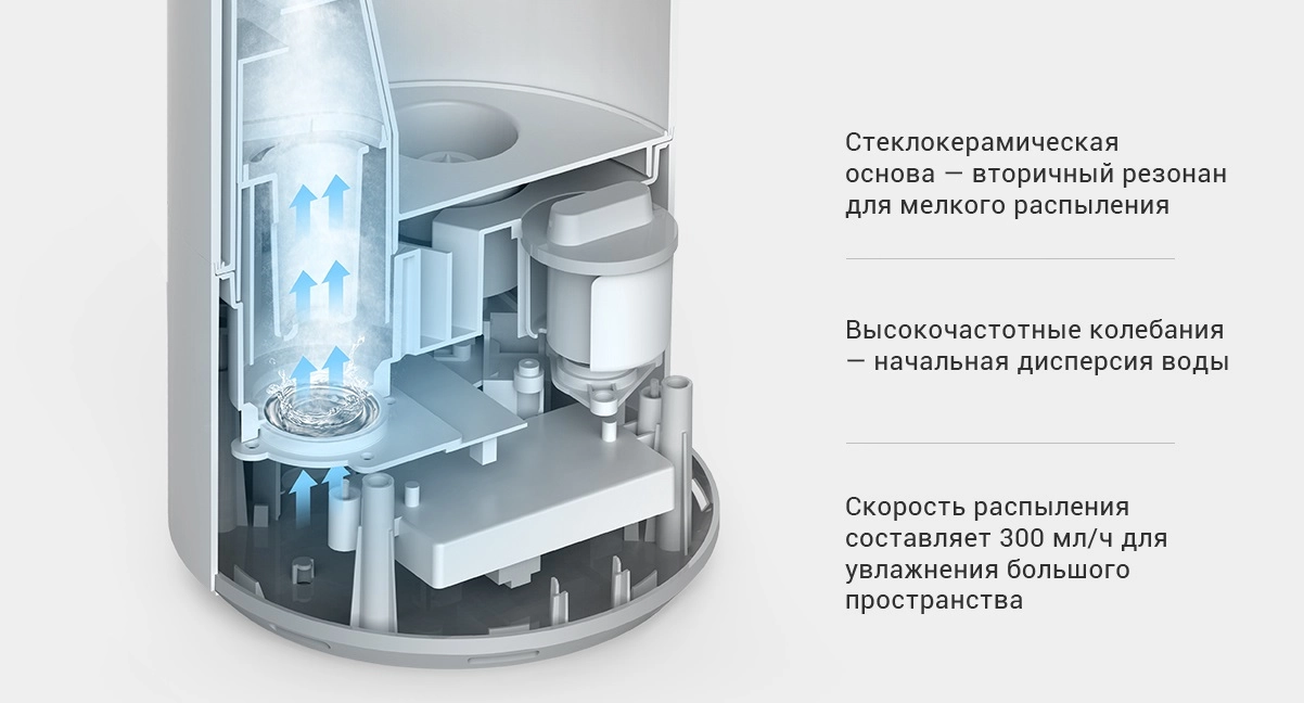 Увлажнитель Xiaomi Smart Sterilization Humidifier оснащен керамическим сердечником и системой распыления сверхмелких частиц размером 1-5 микрон, распыляющихся посредством водяной дымки с расходом 300 мл/ч. Ультрамалые молекулы воды легко проникают и увлажняют кожу.
