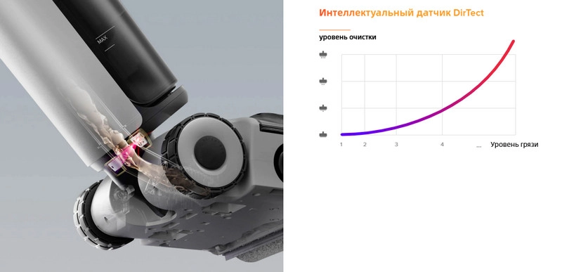 Сенсор DirTect в реальном времени оценивает степень загрязнения и самостоятельно настраивает мощность всасывания, увеличивая её на «тяжёлых» участках и снижая там, где пол уже чист. Такой автоматический контроль гарантирует идеальный результат на любых поверхностях без лишних движений.