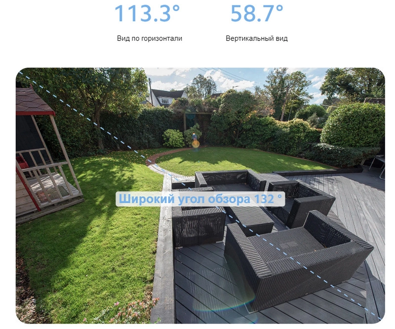 Камера снимает с углом обзора 132°, при этом вертикальный обзор составляет 58,7°, а горизонтальный 113,3°.