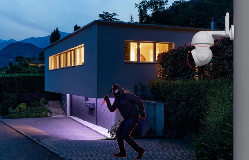 В охранном режиме камера распознает человеческую фигуру — включает сигнализацию и отправляет оповещение на смартфон.
