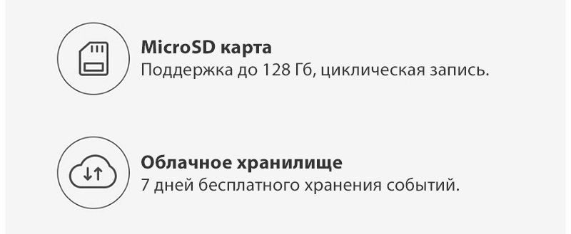 Камера поддерживает MicroSD-карты объемом до 128 ГБ и облачное хранилище. В облачном хранилище предусмотрен бесплатный 7-дневный тариф для хранения записей тревожных оповещений. На картах поддерживается циклическая запись, когда при заполнении карты предыдущие записи стираются и перезаписываются новыми.