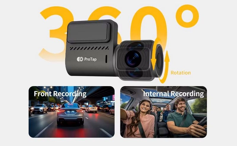 Этот видеорегистратор с поворотной камерой позволяет переключаться между фронтальной записью дороги и съемкой салона автомобиля. Благодаря вращению на 360° вы можете оперативно менять ракурс в зависимости от ситуации, фиксируя важные события как перед транспортным средством, так и внутри него.