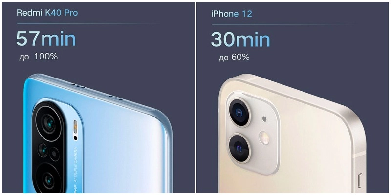 С поддержкой быстрой зарядки Redmi K40 Pro заряжается до 100% за 57 минут, а iPhone 12 до 60% за полчаса.