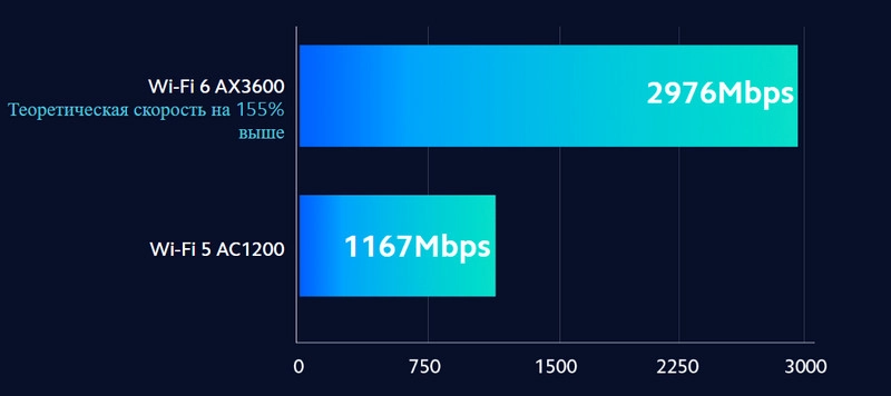 Обновленный стандарт Wi-Fi на 155% увеличивает максимальную пропускную способность роутера. AX3600 работает в двух диапазонах 2,4 ГГц и 5 ГГц, поддерживающих 802.11ax и не мешающих друг другу. Суммарная скорость беспроводного соединения по двум диапазонам достигает 2976 Мбит/сек.