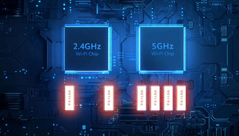 Диапазоны 2,4 ГГц и 5 ГГц дополнены усилителями сигнала. Два у модуля 2,4 ГГц и четыре у модуля 5 ГГц.