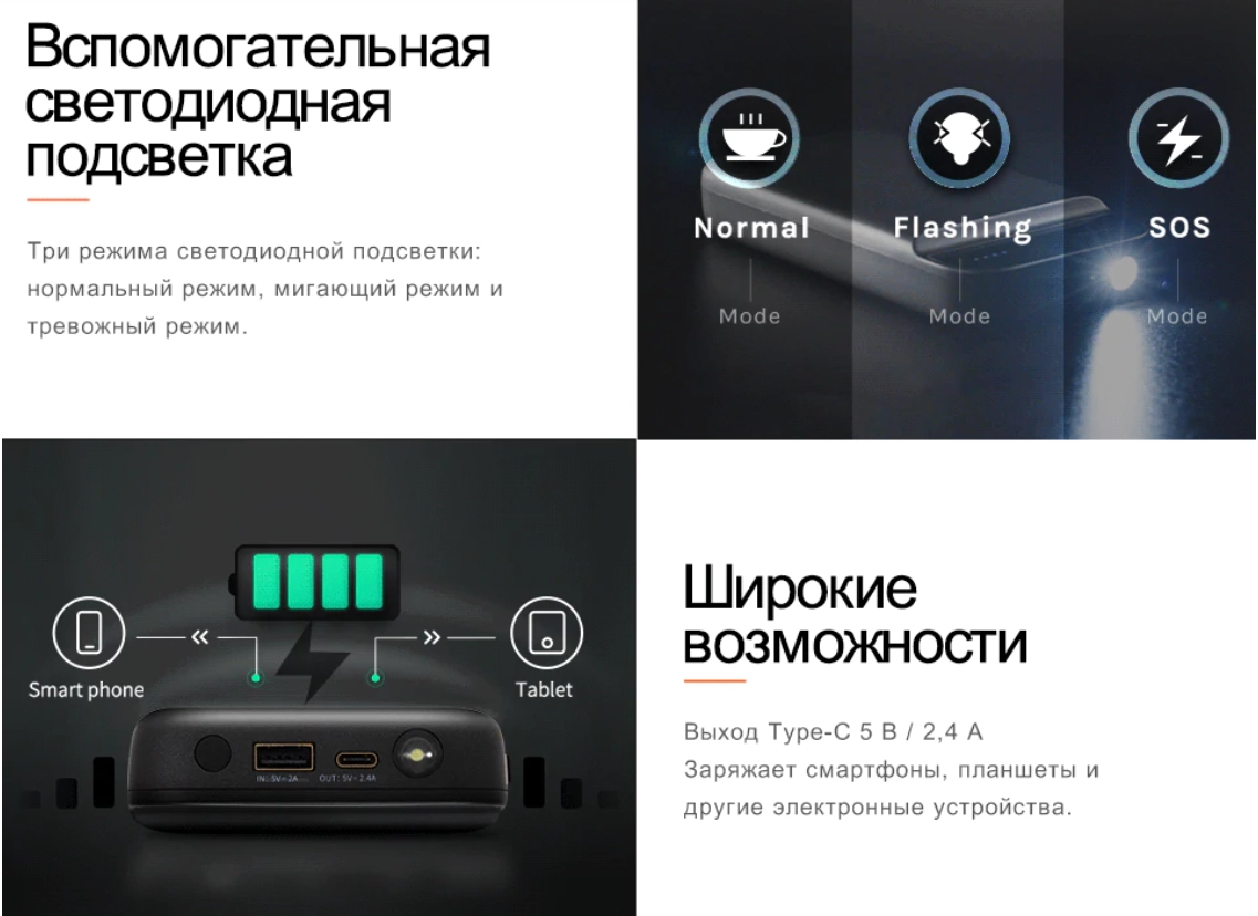 В 70mai jump starter емкостью 11100 мАч встроен USB-порт для зарядки 5 В / 2,4 А и светодиодный фонарик.