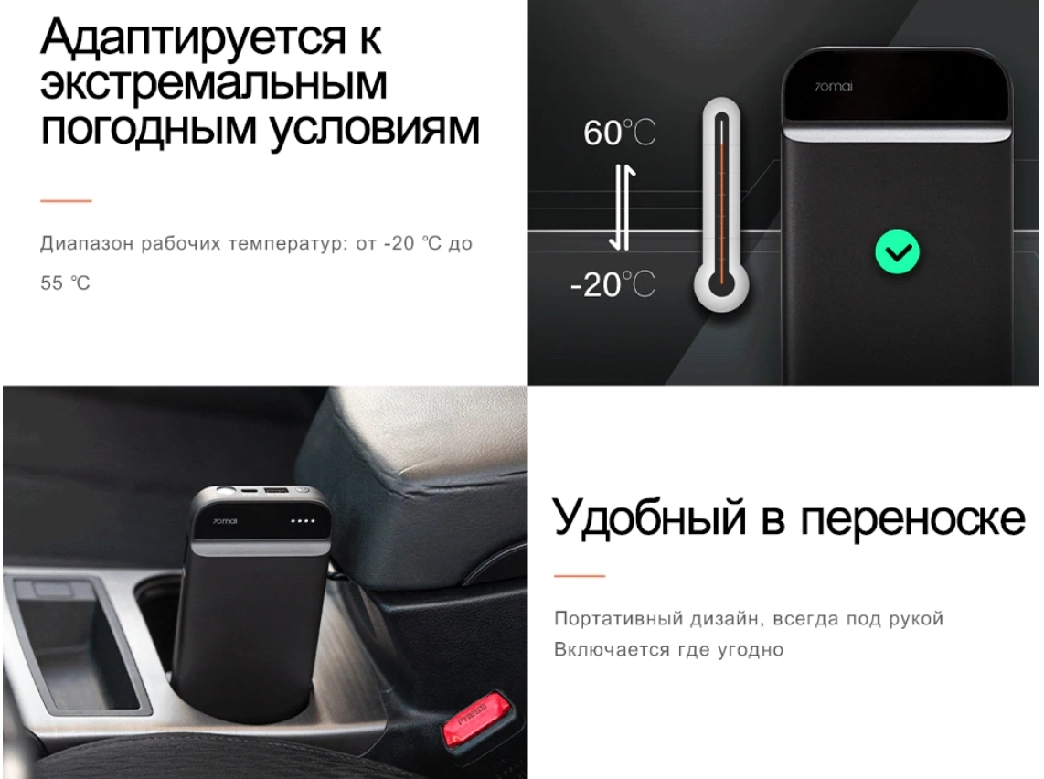 В стартер 70mai встроен светодиодный индикатор батареи. Устройство имеет водонепроницаемый и огнеупорный корпус, на котором не остаются отпечатки пальцев.